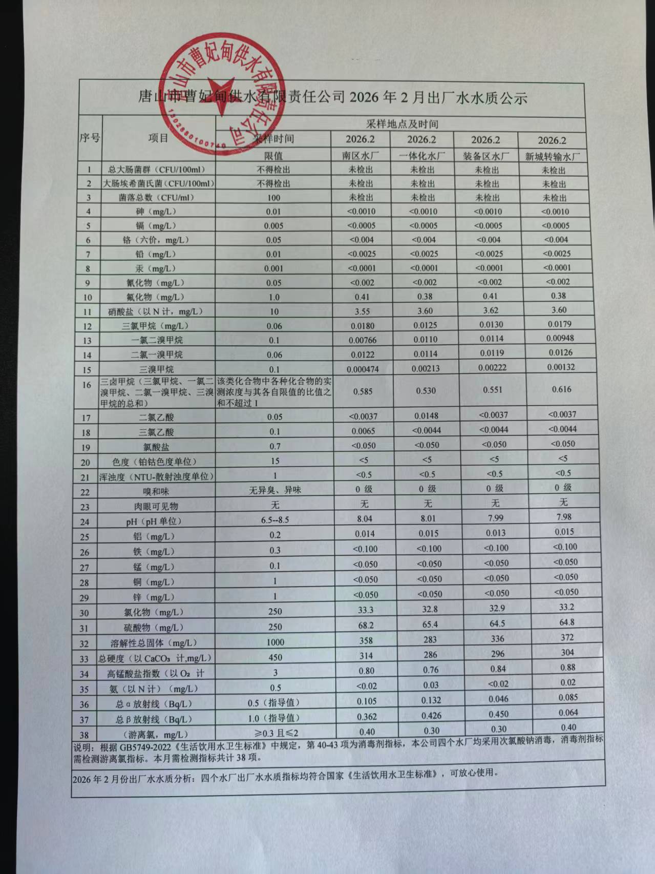 2026年度2月份出厂水月检水质公示