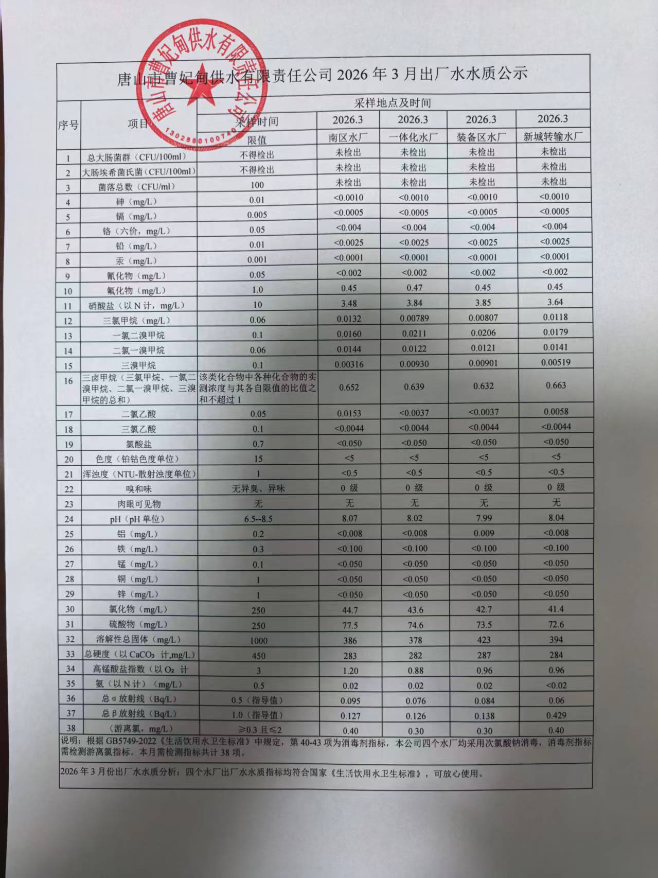 2026年度3月份出厂水月检水质公示